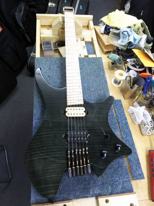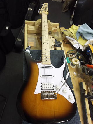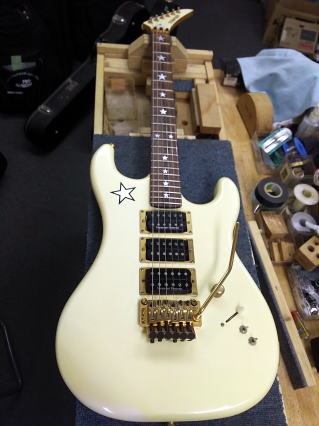 | ●1弦がミディアム、6弦がレギュラーのマルチスケール。 ●ネックグリップの形状が変なので削り直してフレットをステンレス製へ交換。 ●ピックアップをディマジオへ交換。 ●その他作りが悪い部分を改修。 |